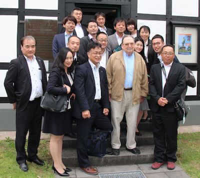Raiffeisen hat in Japan einen besonderen Stellenwert, genießt fast so etwas wie Verehrung. Kein Wunder also, dass das Deutsche Raiffeisenmuseum in Hamm (Sieg) häufiger Gäste aus Asien empfängt. Jüngst war es wieder so weit. Ein japanischer Verlag für landwirtschaftliche Fachzeitschriften hatte eine Abordnung nach Hamm geschickt. Selbstverständlich interessieren sich diese Männer und Frauen ganz besonders für die Wurzeln des Genossenschaftswesens und die Heimat von Friedrich Wilhelm Raiffeisen. Als ehrenamtlicher, aber hoch professioneller Fremdenführer konnte einmal mehr Wolfgang Ebisch von den Heimatfreunden im Hammer Land ihnen Rede und Antwort stehen. Auch Raiffeisenbotschafterin Freyja Schumacher gab einige Erläuterungen und hielt zudem einige Broschüren in japanischer Sprache bereit. Die mündlichen Informationen wurden übersetzt von Mutsumi Aoki, die in Hamm schon eine alte Bekannte ist. Foto: Schumacher (VG Hamm)