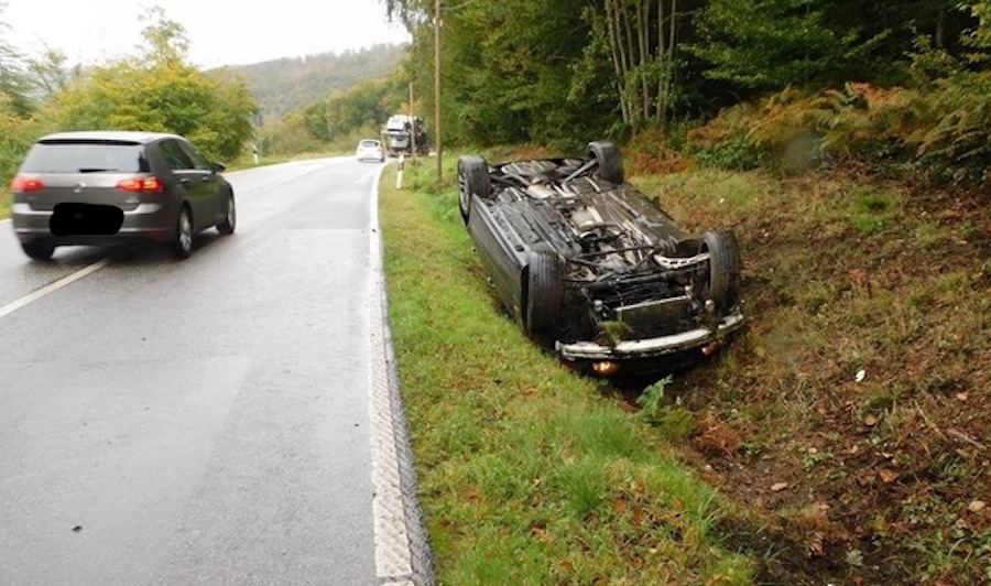 Am 06.10.2021, gegen 10.55 Uhr befuhr ein 18-jähriger Pkw-Fahrer die B 62 aus Wallmenroth kommend in Richtung Wissen. Im Verlauf der Strecke fuhr er mit den örtlichen und witterungsbedingten Verhältnissen unangepassten Geschwindigkeit. Dabei kam er ausgangs einer Linkskurve nach rechts von der Fahrbahn ab, überschlug sich und kam schließlich auf dem Fahrzeugdach liegend zum Stillstand. Der 18-jährige Fahrer und seine 18-jährige Begleiterin wurden leichtverletzt; am Pkw entstand Sachschaden. (Quelle Polizei Montabaur)